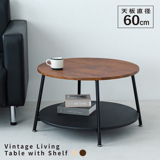 ◯ ヴィンテージ棚付リビングテーブル サイドテーブル 木製 木目 丸 モダン ひとり暮らし 収納