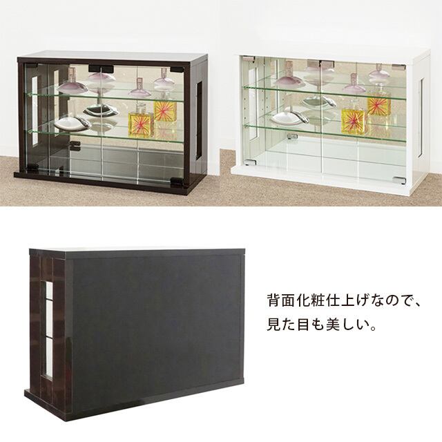 ◆背面はカガミ張りで奥行が感じられ、全面・側面・棚板がガラスですので解放感があり、圧迫感を抑えます。