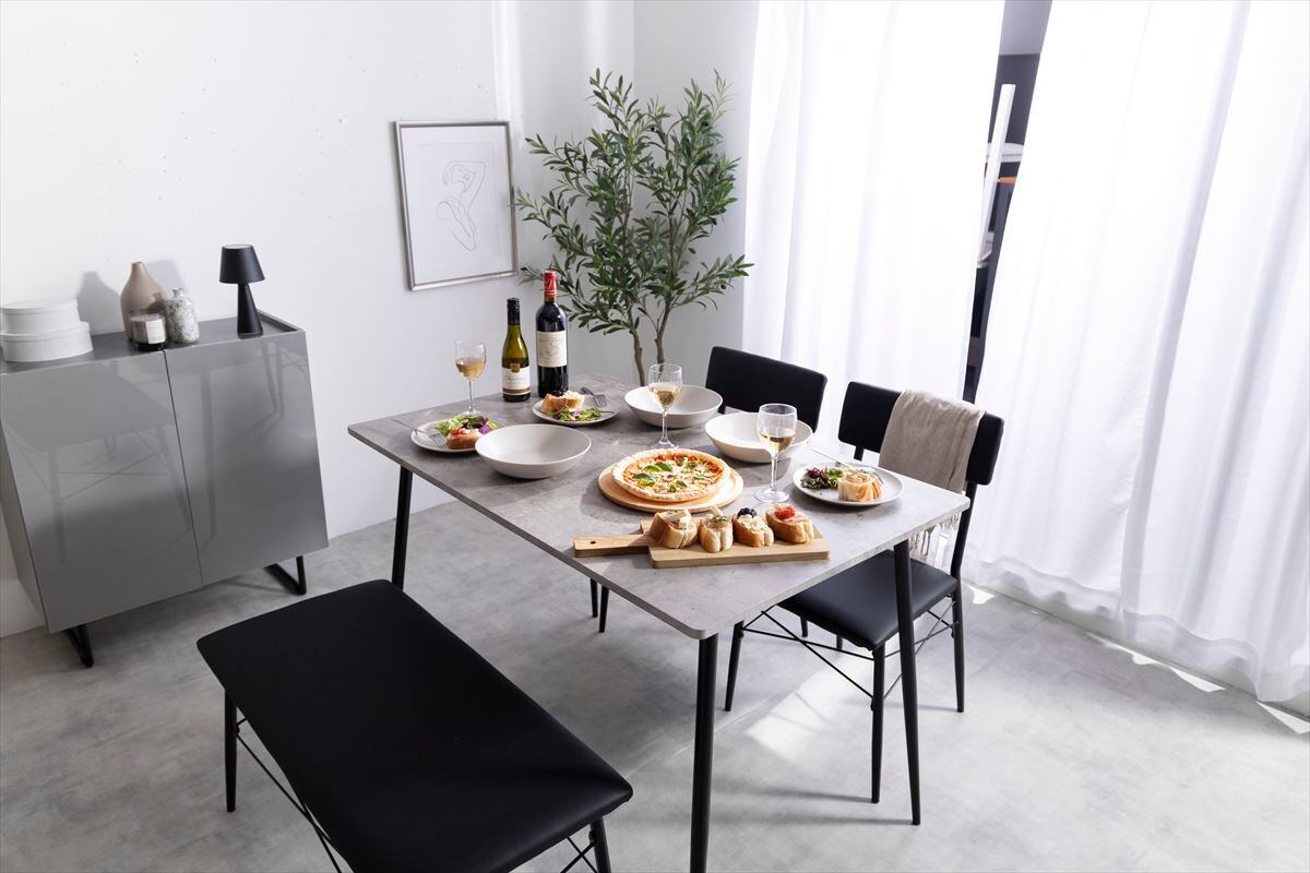石目柄とブラックスチールを組み合わせた『Evie(エヴィ)』シリーズのダイニングセット