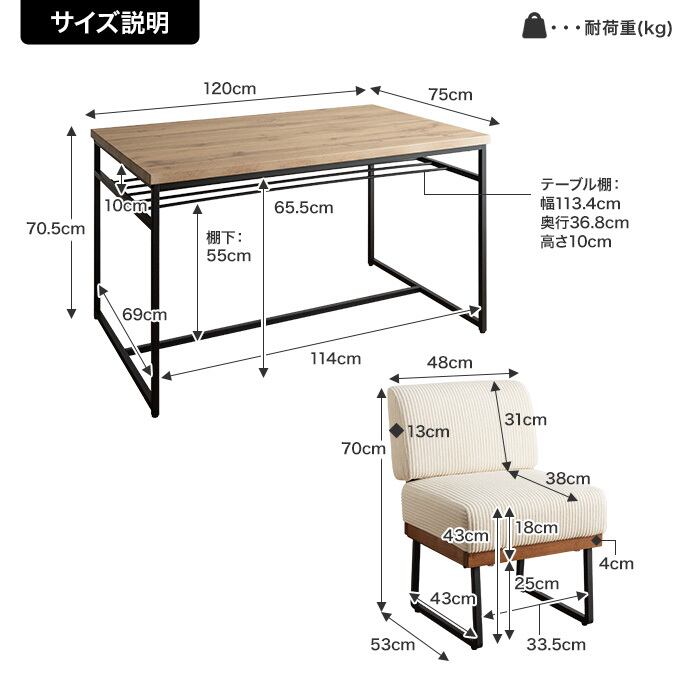 【耐荷重】テーブル天板:約50kg、テーブル棚:約15kg、ソファ(1脚あたり)約100kg