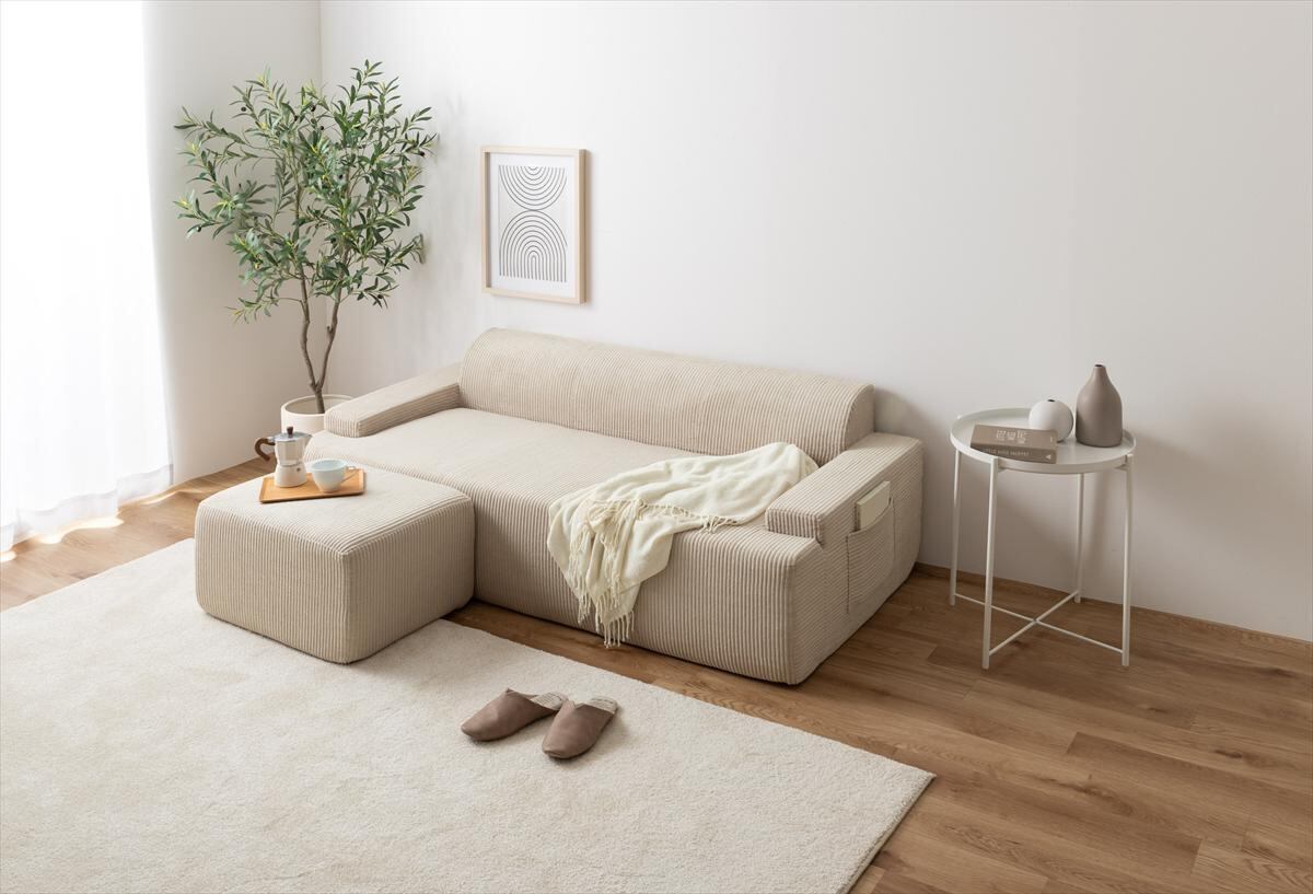 小さく届いて広々使える、快適圧縮シリーズの3人掛けソファ+オットマンセット