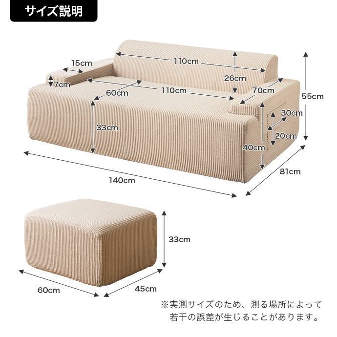 【ソファ】幅140cm×奥行81cm×高さ55cm(座面高:33cm)
