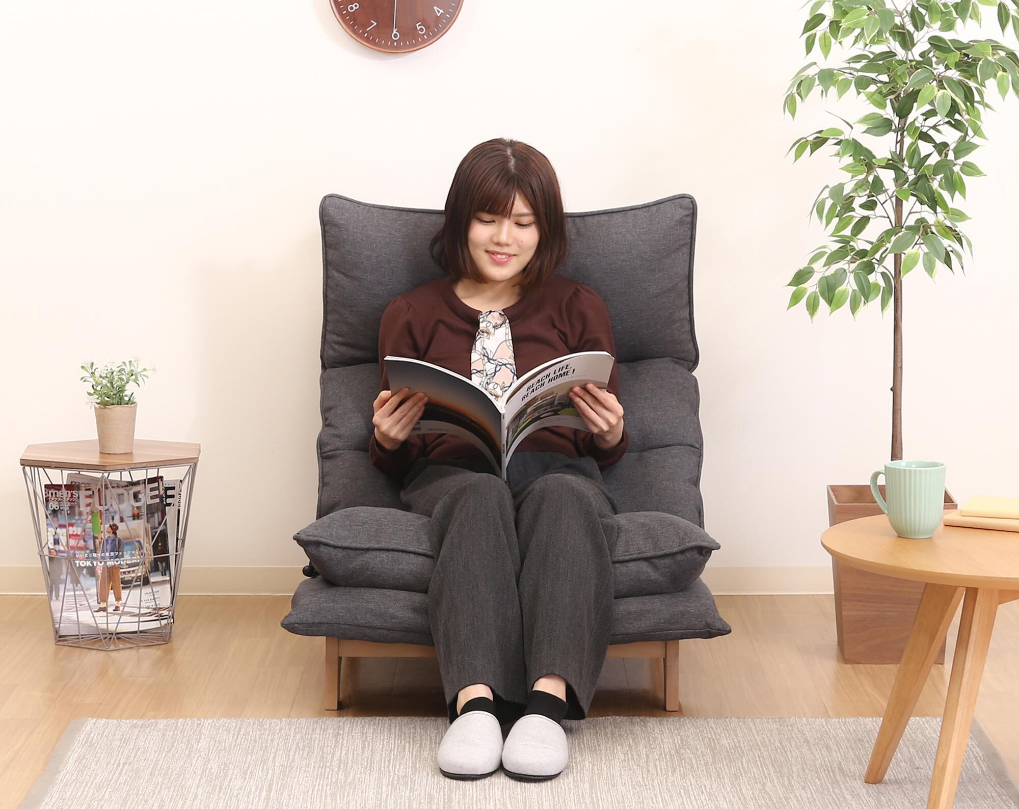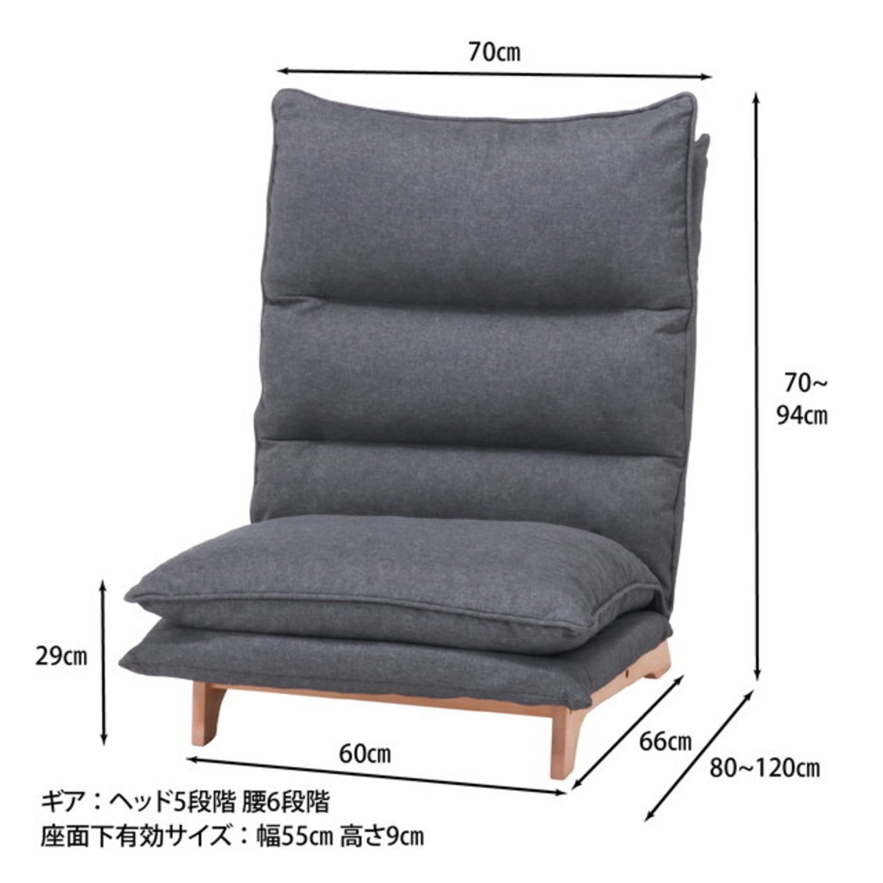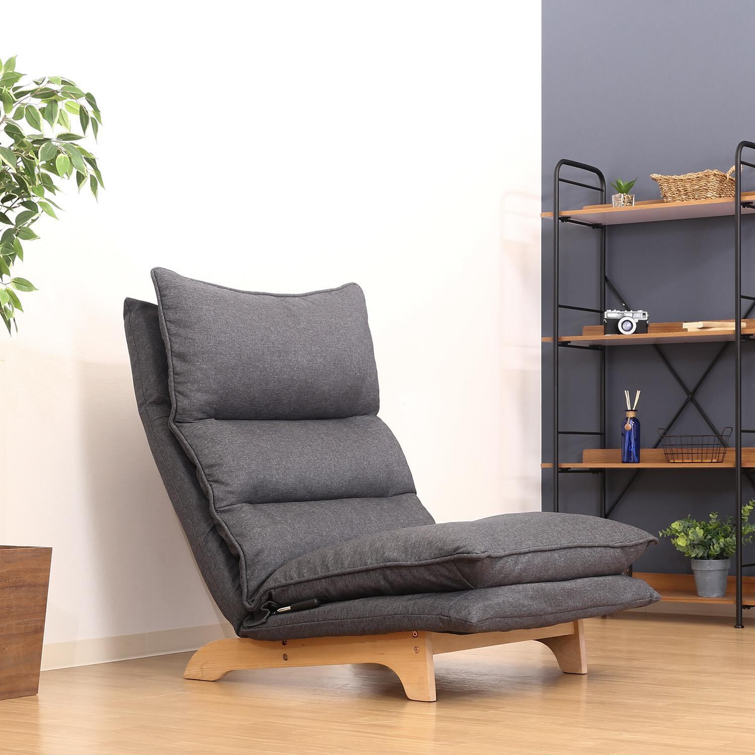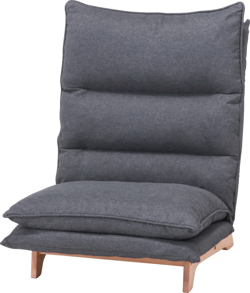 レバーで簡単6段階調節。体にフィットする心地良いお好みの角度に調節できます。ヘッドも細やかな角度調整が可能。〈br〉頭にフィットするヘッドレストや、フラットにして背もたれとしても使えます。首や肩の負担を軽減するハイバック仕様。〈br〉男性でもゆったりと寄りかかれます。ダブルクッションで座面はふかふか。ゆったりリラックスできます。座面下とダブルクッションの高さがあるので、立ち上がりやすいこともポイントです。夏はべたつかず、冬はひんやりとしない、ファブリック素材を使用しています。シート高さ290mm/構造部材:金属(鋼)/張り材:ポリエステル/クッション材:ウレタンフォーム/構造部材(フレーム):天然木/スチールパイプ/腰部レバー式6段階ギア+ヘッド部5段階ギア(KOYO)