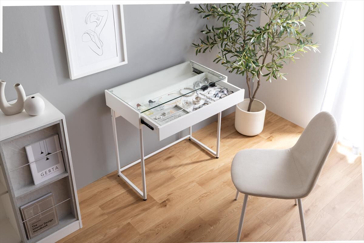 お気に入りのコスメやアクセサリーがディスプレイできる、ショーケースのような美しいガラスデスク
