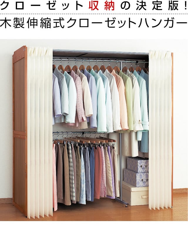 高級感のある側板を使用した〈棚なし・棚付き〉伸縮式クローゼットハンガー。