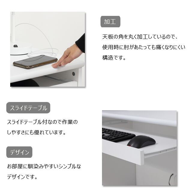 ◆天板の角を丸く加工しているので、使用時に肘があたっても痛くなりにくい構造です。