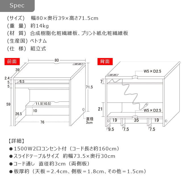 ●板厚約(天板=2.4cm、側板=1.8cm、その他=1.5cm)
